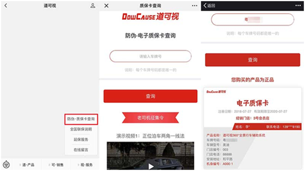 通過電子質???,用戶可以免費享受2年的質保和全國聯(lián)保服務;可以隨時查詢產品的售后期限和相關售后政策;可以查詢到道可視分布全國的銷售網絡;可以查詢到所在城市、地區(qū)的全國聯(lián)保門店,方便就近選擇售后門店;可以在線聯(lián)系官方客服,預約售后時間和地點。
