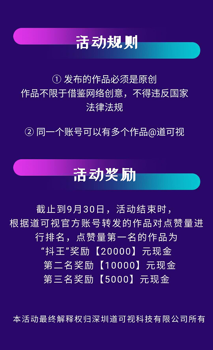 2020道可視“抖王”爭霸賽第一季截止到9月31日,活動結(jié)束時,根據(jù)道可視官方賬號轉(zhuǎn)發(fā)的作品對點贊量進行排名,點贊量第一名的作品為“抖王”獎勵【20000】元現(xiàn)金;第二名獎勵【10000】元現(xiàn)金;第三名獎勵【5000】元現(xiàn)金。